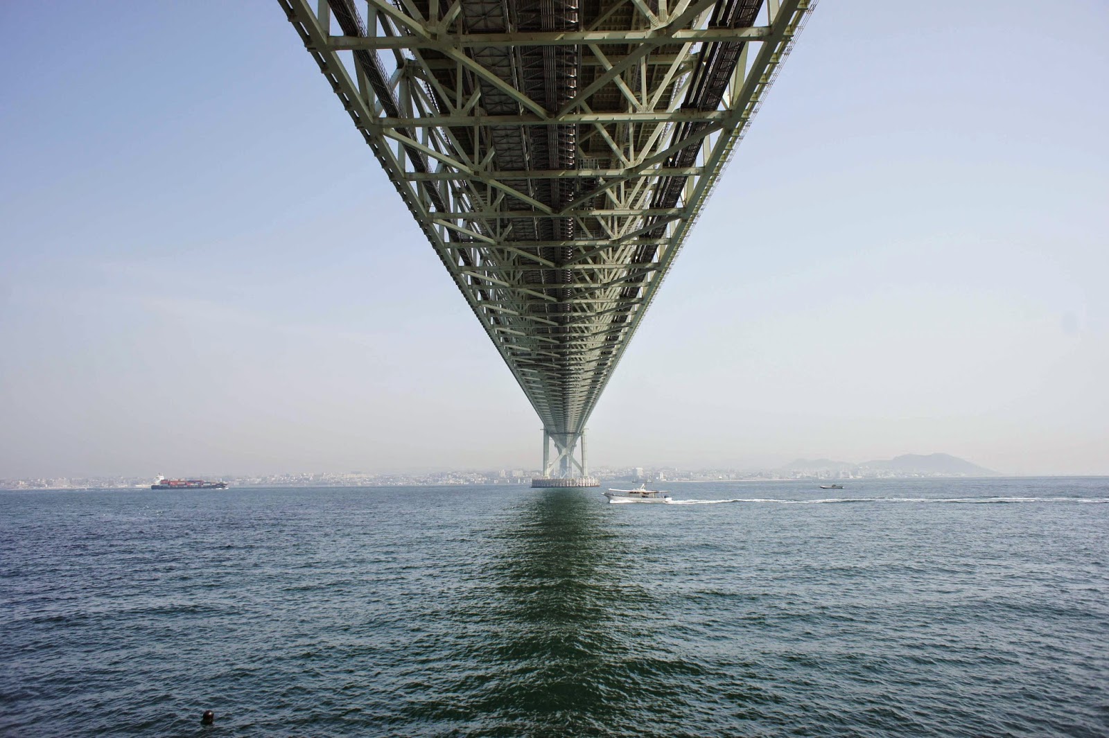 One of Japan’s greatest engineering feats. The Akashi Straits is four miles wide at the bridge site with sea depths of over 300 feet. The two large anchor blocks each weigh 350,000 tons. It took ten years to construct the bridge, 181,000 tons of steel and 1.4 million cubic yards of concrete. The steel cable used would circle the world seven times. The two main supporting towers stand 975 feet above the strait’s surface, making it one of the tallest bridges in the world. The Akashi Straits is one of the busiest sea lanes in the world with over a thousand cargo ships per day pass under the bridge.