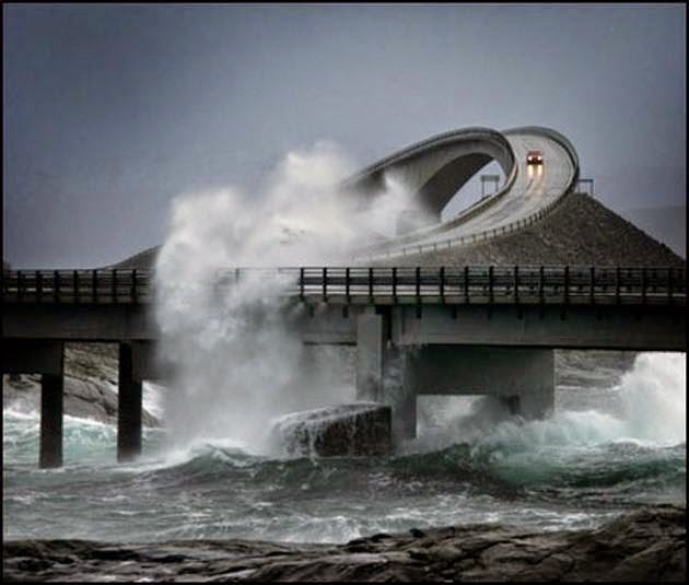 From certain angles the Storseisundet Bridge—part of a popular road-trip route linking small villages along the Atlantic Ocean—seems to vanish in midair. The 850 foot-long simple arch, and accidental optical illusion, was constructed in 1989 and makes a bend in the middle of the span that hides the other half from view.