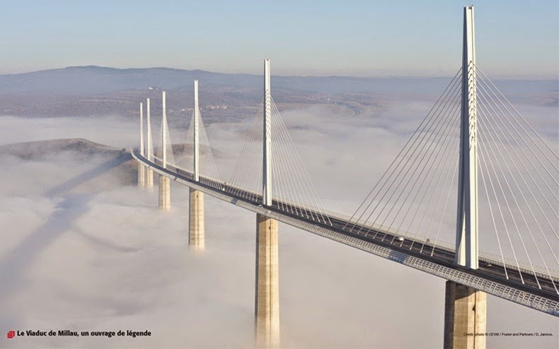 The tallest mast stands at about 1,125 feet over the Tarn River valley, making the Millau Viaduct the world’s tallest bridge. It doesn’t cross over water, but thick fog often rolls into the valley, obscuring the surrounding hills and valleys. Its construction cost more than half a billion dollars and took just over three years to complete. The builders, Eiffage, financed the construction in return for a concession to collect the tolls for 75 years, until 2080. The project required about 127,000 cubic yards of concrete, 19,000 tons of steel for the reinforced concrete and 5,000 tons of pre-stressed steel for the cables and shrouds.